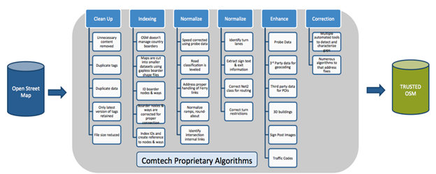 Proprietary algorithms normalize attributes like ramps, roundabouts, route types and road names. These algorithms identify missing attributes in OSM data and add them into TOSM. Realtime navigation benefits from detailed road attributes, enhancing the overall user experience. These algorithms scan the data, adjust road classifications, and add rich elements important for routing.